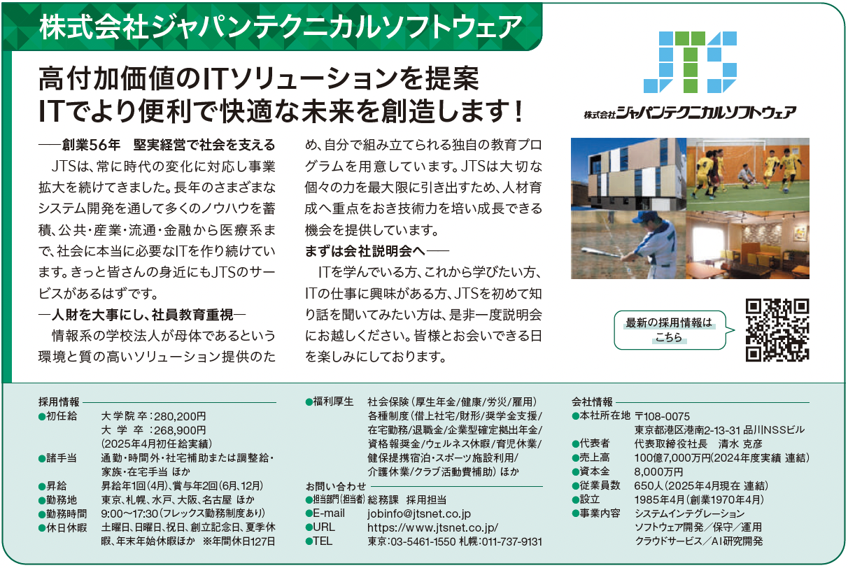 IT志望の就活生 IT業界への就職を目指す就活生 就職相談をする ITの仕事の中身とは? 入社3年後・5年後はこうなる 就活アドバイス 協賛企業紹介 協力大学一覧 IT産業懇話会とは セミナー・イベント情報一覧 IT企業採用担当者 IT企業採用担当者の方 入会案内 お問い合わせ IT産業懇話会とは 協賛企業紹介 協力大学一覧 セミナー・イベント情報一覧 学校関係者 大学・専門学校など学生の就職活動を支援されている方 入会案内 お問い合わせ IT産業懇話会とは 協賛企業紹介 協力大学一覧 セミナー・イベント情報一覧 入会案内 IT産業懇話会とは セミナー・イベント情報 協賛企業紹介 協力大学一覧 役員紹介 入会案内 企業向けお問い合わせ プライバシーポリシー 就活生向けお問い合わせ(就職相談) ITの仕事の中身とは? 入社3年後・5年後はこうなる 就活アドバイス IT業界徹底研究 就職ガイド(日経BP発行) Employment Guide IT産業懇話会とは 協賛企業紹介 協力大学一覧 活動目的・内容 役員紹介 お問い合わせ【企業】 就職相談【学生】 株式会社 ジャパンテクニカルソフトウェア IT業界徹底研究就職ガイド2027年版(日経BP発行) https://www.jtsnet.co.jp/