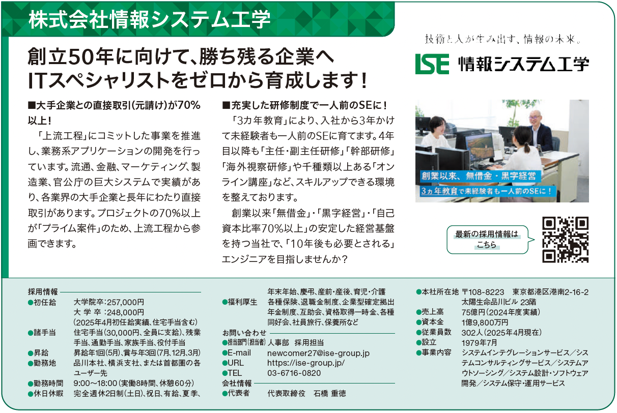 IT志望の就活生 IT業界への就職を目指す就活生 就職相談をする ITの仕事の中身とは? 入社3年後・5年後はこうなる 就活アドバイス 協賛企業紹介 協力大学一覧 IT産業懇話会とは セミナー・イベント情報一覧 IT企業採用担当者 IT企業採用担当者の方 入会案内 お問い合わせ IT産業懇話会とは 協賛企業紹介 協力大学一覧 セミナー・イベント情報一覧 学校関係者 大学・専門学校など学生の就職活動を支援されている方 入会案内 お問い合わせ IT産業懇話会とは 協賛企業紹介 協力大学一覧 セミナー・イベント情報一覧 入会案内 IT産業懇話会とは セミナー・イベント情報 協賛企業紹介 協力大学一覧 役員紹介 入会案内 企業向けお問い合わせ プライバシーポリシー 就活生向けお問い合わせ(就職相談) ITの仕事の中身とは? 入社3年後・5年後はこうなる 就活アドバイス IT業界徹底研究 就職ガイド(日経BP発行) Employment Guide IT産業懇話会とは 協賛企業紹介 協力大学一覧 活動目的・内容 役員紹介 お問い合わせ【企業】 就職相談【学生】 株式会社 情報システム工学 IT業界徹底研究就職ガイド2027年版(日経BP発行) http://ise-group.jp/