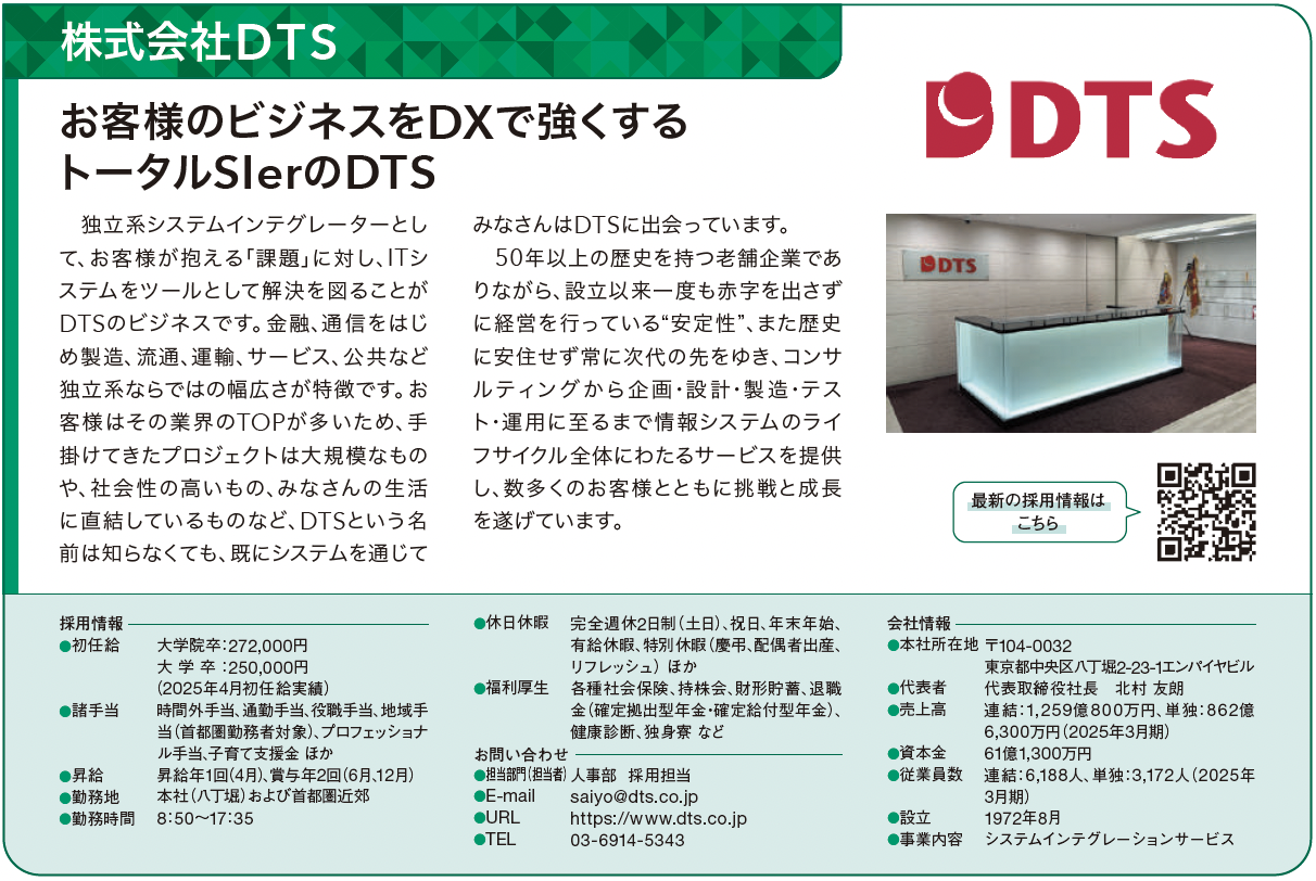IT志望の就活生 IT業界への就職を目指す就活生 就職相談をする ITの仕事の中身とは? 入社3年後・5年後はこうなる 就活アドバイス 協賛企業紹介 協力大学一覧 IT産業懇話会とは セミナー・イベント情報一覧 IT企業採用担当者 IT企業採用担当者の方 入会案内 お問い合わせ IT産業懇話会とは 協賛企業紹介 協力大学一覧 セミナー・イベント情報一覧 学校関係者 大学・専門学校など学生の就職活動を支援されている方 入会案内 お問い合わせ IT産業懇話会とは 協賛企業紹介 協力大学一覧 セミナー・イベント情報一覧 入会案内 IT産業懇話会とは セミナー・イベント情報 協賛企業紹介 協力大学一覧 役員紹介 入会案内 企業向けお問い合わせ プライバシーポリシー 就活生向けお問い合わせ(就職相談) ITの仕事の中身とは? 入社3年後・5年後はこうなる 就活アドバイス IT業界徹底研究 就職ガイド(日経BP発行) Employment Guide IT産業懇話会とは 協賛企業紹介 協力大学一覧 活動目的・内容 役員紹介 お問い合わせ【企業】 就職相談【学生】 株式会社 DTS IT業界徹底研究就職ガイド2027年版(日経BP発行) https://www.dts.co.jp/corp/company/