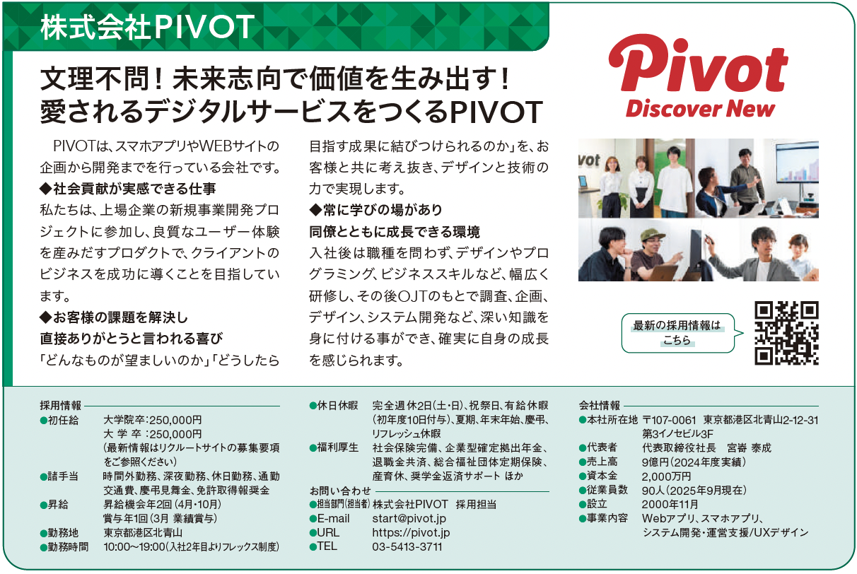 IT志望の就活生 IT業界への就職を目指す就活生 就職相談をする ITの仕事の中身とは? 入社3年後・5年後はこうなる 就活アドバイス 協賛企業紹介 協力大学一覧 IT産業懇話会とは セミナー・イベント情報一覧 IT企業採用担当者 IT企業採用担当者の方 入会案内 お問い合わせ IT産業懇話会とは 協賛企業紹介 協力大学一覧 セミナー・イベント情報一覧 学校関係者 大学・専門学校など学生の就職活動を支援されている方 入会案内 お問い合わせ IT産業懇話会とは 協賛企業紹介 協力大学一覧 セミナー・イベント情報一覧 入会案内 IT産業懇話会とは セミナー・イベント情報 協賛企業紹介 協力大学一覧 役員紹介 入会案内 企業向けお問い合わせ プライバシーポリシー 就活生向けお問い合わせ(就職相談) ITの仕事の中身とは? 入社3年後・5年後はこうなる 就活アドバイス IT業界徹底研究 就職ガイド(日経BP発行) Employment Guide IT産業懇話会とは 協賛企業紹介 協力大学一覧 活動目的・内容 役員紹介 お問い合わせ【企業】 就職相談【学生】 株式会社 PIVOT IT業界徹底研究就職ガイド2027年版(日経BP発行) https://pivot.jp/recruitment/