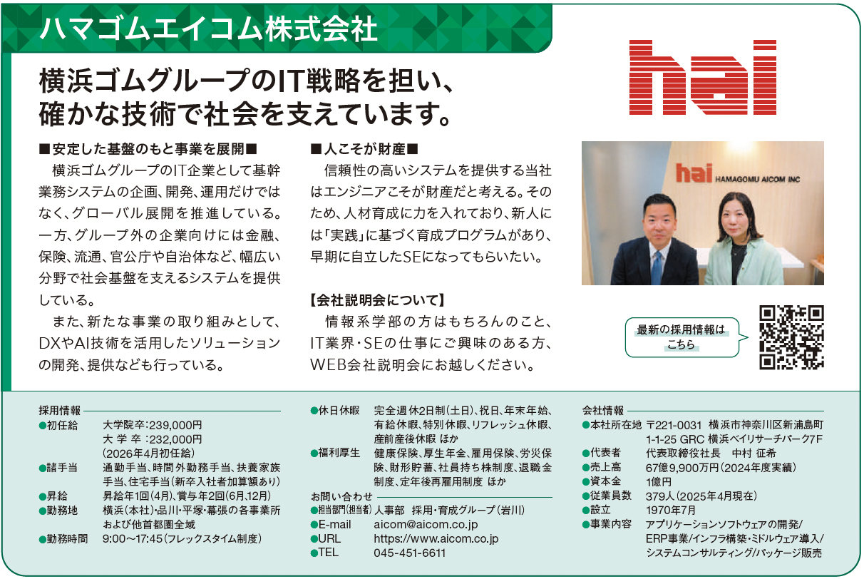 IT志望の就活生 IT業界への就職を目指す就活生 就職相談をする ITの仕事の中身とは? 入社3年後・5年後はこうなる 就活アドバイス 協賛企業紹介 協力大学一覧 IT産業懇話会とは セミナー・イベント情報一覧 IT企業採用担当者 IT企業採用担当者の方 入会案内 お問い合わせ IT産業懇話会とは 協賛企業紹介 協力大学一覧 セミナー・イベント情報一覧 学校関係者 大学・専門学校など学生の就職活動を支援されている方 入会案内 お問い合わせ IT産業懇話会とは 協賛企業紹介 協力大学一覧 セミナー・イベント情報一覧 入会案内 IT産業懇話会とは セミナー・イベント情報 協賛企業紹介 協力大学一覧 役員紹介 入会案内 企業向けお問い合わせ プライバシーポリシー 就活生向けお問い合わせ(就職相談) ITの仕事の中身とは? 入社3年後・5年後はこうなる 就活アドバイス IT業界徹底研究 就職ガイド(日経BP発行) Employment Guide IT産業懇話会とは 協賛企業紹介 協力大学一覧 活動目的・内容 役員紹介 お問い合わせ【企業】 就職相談【学生】 ハマゴムエイコム 株式会社 IT業界徹底研究就職ガイド2027年版(日経BP発行) https://www.aicom.co.jp/profile/