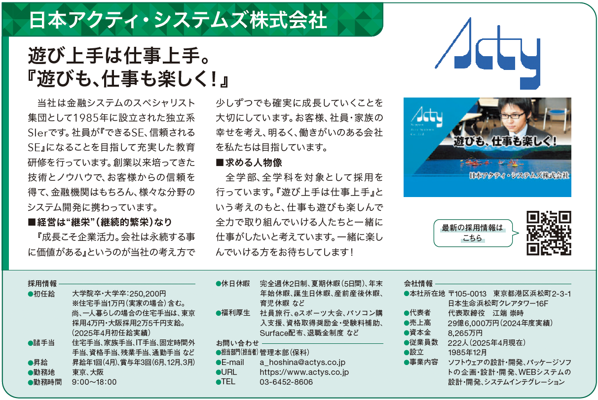 IT志望の就活生 IT業界への就職を目指す就活生 就職相談をする ITの仕事の中身とは? 入社3年後・5年後はこうなる 就活アドバイス 協賛企業紹介 協力大学一覧 IT産業懇話会とは セミナー・イベント情報一覧 IT企業採用担当者 IT企業採用担当者の方 入会案内 お問い合わせ IT産業懇話会とは 協賛企業紹介 協力大学一覧 セミナー・イベント情報一覧 学校関係者 大学・専門学校など学生の就職活動を支援されている方 入会案内 お問い合わせ IT産業懇話会とは 協賛企業紹介 協力大学一覧 セミナー・イベント情報一覧 入会案内 IT産業懇話会とは セミナー・イベント情報 協賛企業紹介 協力大学一覧 役員紹介 入会案内 企業向けお問い合わせ プライバシーポリシー 就活生向けお問い合わせ(就職相談) ITの仕事の中身とは? 入社3年後・5年後はこうなる 就活アドバイス IT業界徹底研究 就職ガイド(日経BP発行) Employment Guide IT産業懇話会とは 協賛企業紹介 協力大学一覧 活動目的・内容 役員紹介 お問い合わせ【企業】 就職相談【学生】 日本アクティ・システムズ 株式会社 IT業界徹底研究就職ガイド2027年版(日経BP発行) https://www.actys.co.jp/